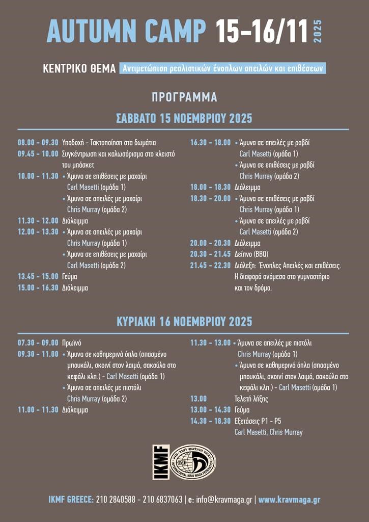 Όπως πάντα, το Autumn Camp έχει μια πολύ πλούσια θεματολογία, την οποία μπορείτε να δείτε στο αναλυτικό πρόγραμμα του Καμπ, το οποίο σας επισυνάπτουμε. Όπως όλοι γνωρίζετε, το Κραβ Μαγκά δεν είναι μόνο τεχνικές και στο Καμπ μας δίνεται η δυνατότητα να δουλέψουμε έξω από τα ασφαλή πλαίσια της σχολής, πιο κοντά στις αληθινές συνθήκες.